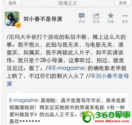 听说是青岛市长,后来被辟谣,据@E-magazine 爆料:网友爆料不雅照中的男者系电影《有一种爱叫做放手》的出品人王子玉,一龙三凤很happy。连该片导演半夜火速澄清若属实再不接此人片子。网友爆料右边女子疑似曾多次在影视剧中塑造女政委、女八路、女干警的女明星,眼力好的网友请围观求真相。。。。。对此@艾君AIJUN 在微博评论:“有人情人节炮出艳照把男主张冠李戴加给青岛某领导,借此炒作腐败,顿时沸沸扬扬。网络诚信需大家一起维护,公信力需一起树立,莫以八卦谣言惑众 吸民眼球,如此会毁网络信誉.”