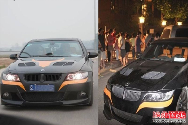 几天,著名军旅歌唱家李双江、梦鸽夫妇的儿子李天一涉嫌轮奸的新闻充斥着大小传媒,因为这家伙是第二次“犯事”了。这里说说李天一的座驾,改款宝马3. 李天一因为无证驾驶 宝马 车还打人,引发网友人肉搜索,查出其在事发前,曾在汽车论坛上晒自己改装宝马车的全过程,号称花了18万做改装。 从车主发帖的照片和李双江儿子李天一打人事件现场留下的车辆来看,两车就是同一辆车。 现在我们来看看这辆宝马改装了哪些地方?