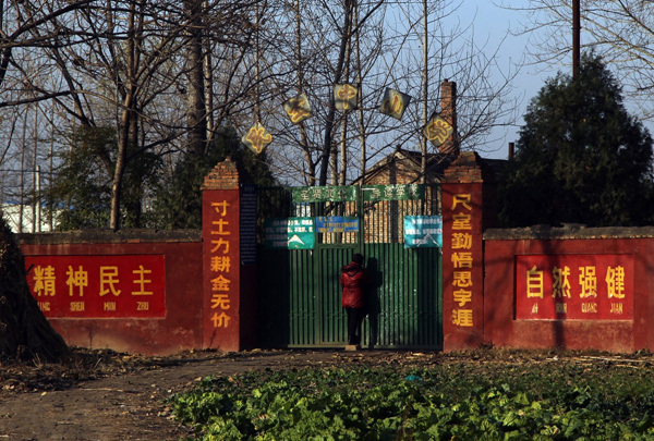 2012年11月27日,河南省周口市淮阳县四通镇民主中小学,学校大门。