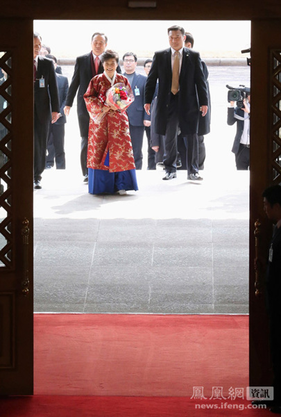 当地时间2013年2月25日,韩国首尔,韩国新任总统朴槿惠在就职典礼结束后身着韩服进入青瓦台。