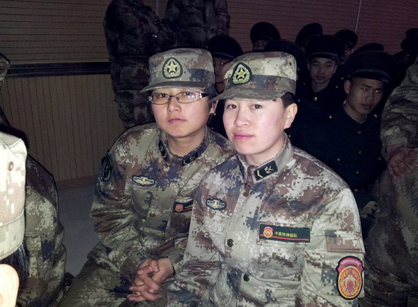 新兵连时,虽不在一个班,但积极上进的性格总能让她们在各种公差勤务中不期而遇。下连后,甚至到了第二年,她们两姐妹还和新兵连那会儿一样,什么脏活累活总是抢着干,战友说她们怎么这么“二”,跟个新兵似的,陈亚男和杜思敏相视一笑,“能为大家干点儿活,觉得自己可幸福了!”每天下午的体能训练,她俩也总是积极地站在排头,紧紧跟着前边的男兵队伍,直到班长喊着让她俩慢一点,她们才放慢了速度,心里却很是不甘。